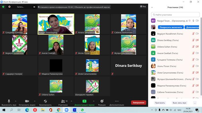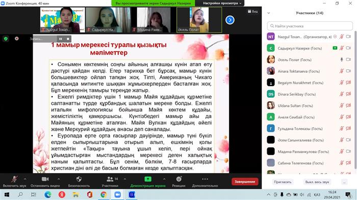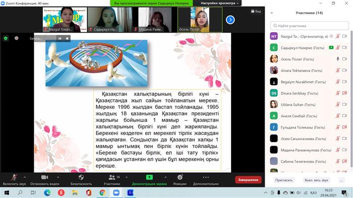 29.04.2021 жыл сағат 16:00 де психология мамандығының 2 курс 3 топ студенттері 1-ші мамырға арналған "Бірлік пен береке күніне" орай мерекелік кездесу ұйымдастырды. Кездесу онлайн форматта Зуум арқылы өткізілді. Мерекенің мақсаты: студенттерге "Бірлік пен береке күні" туралы ақпараттармен таныстыру, олардың бойында өзге ұлтқа деген құрмет сезімін ояту.