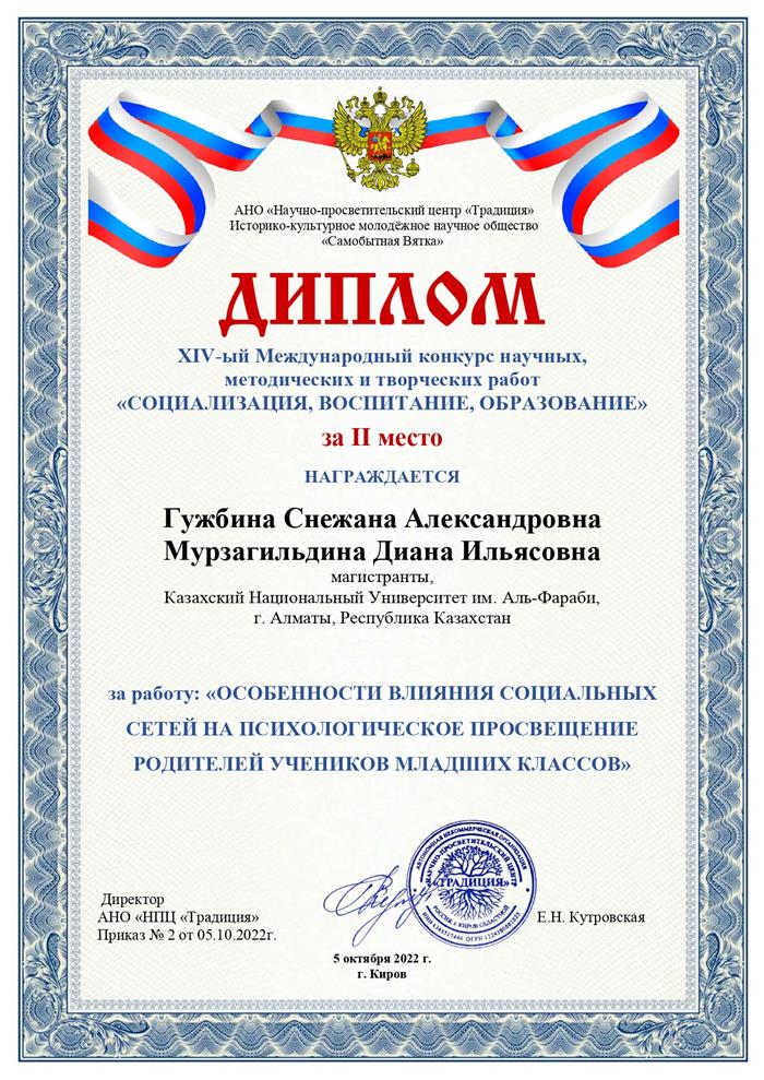 Әл-Фараби атындағы ҚазҰУ Жалпы және қолданбалы психология кафедрасы «Психология» мамандығының 1-курс магистранттары Гужбина Снежана Ильясовна мен Мурзагильдина Диана Ильясовнаны XIV Халықаралық ғылыми, әдістемелік және шығармашылық жұмыстар конкурсында 2 орын дипломымен құттықтайды. Магистранттардың жұмыс тақырыбы: «Бастауыш сынып оқушыларының ата-аналарын психологиялық ағартуға әлеуметтік желілердің ықпал ету ерекшеліктері».