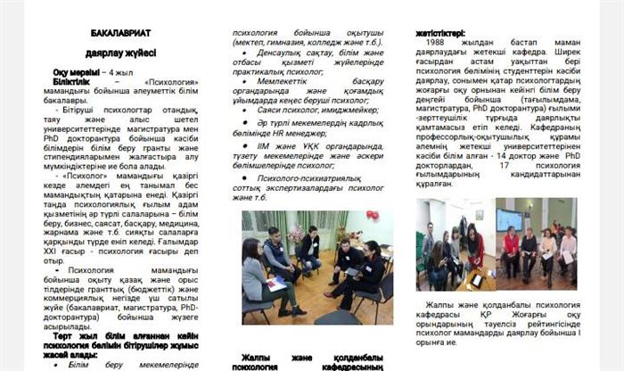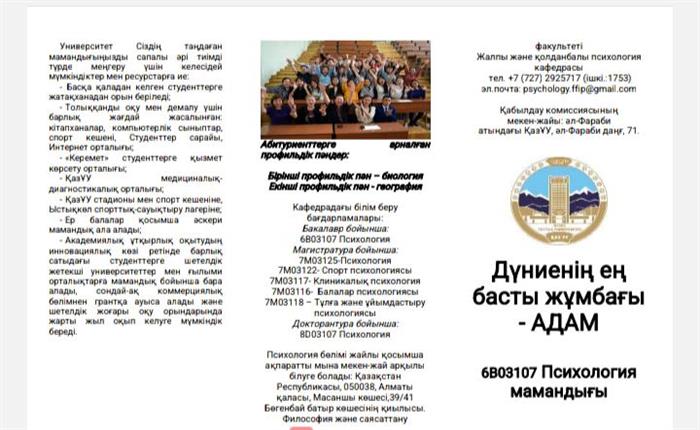 18.02.2023ж. "Жас әл- Фараби" мектеп оқушыларының ғылыми-зерттеу жұмыстарының Х республикалық конференциясында жалпы және қолданбалы психология кафедрасының аға оқытушысы Ж.М.Молбасынова конференцияға қатысушылармен кәсіби бағдар беру бағытында кездесу өткізді. Қатысушылар "Психология" мамандығының үш сатылы білім беру жүйесімен (бакалавриат, магистратура, PhD докторантура) танысты. Кафедраның мамандар даярлаудағы және ғылыми жетістіктеріне тоқтала келіп, бүгінгі таңдағы "психолог" маманының жұмыс бағыттары жөнінде мәлімет берді. Кездесу оқушылардың мамандық таңдаудағы көкейкесті мәселелерді талқылау сұрақтарымен және "Абитуриент 2023" буклетін таратумен аяқталды.