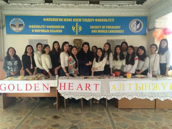 21.11.2016 күні 12:00 де Филология және әлем тілдері факультетінде, Жалпы және қолданбалы псиxология кафедрасының аға оқытушысы Лиясова Айгүл Амангельдиевнаның және Шетел филологиясы мамандығының, 1-2 курс студенттерінің ұйымдастыруымен "Алтын жүрек" атты қайырымдылық жәрмеңкесі өтті. Жәрмеңкеде студенттер даярлаған әр түрлі тағамдар және қолөнер бұйымдары ұсынылды. Жәрмеңке нәтижесінде 45мың теңге сомасында қаражат жиналды. Жиналған қаражат қоры "Нұр" балалар үйіне жіберілді.