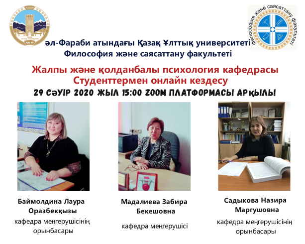 2020 жылғы 29 сәуірде әл-Фараби атындағы Қазақ ұлттық университетінің жалпы және қолданбалы психология кафедрасының меңгерушісі, профессор Мадалиева Забира Бекешқызы «Психология» мамандығының студенттері және магистранттарымен онлайн кездесу жүргізді. Сонымен қатар, кездесуге кафедра меңгерушісінің орынбасарлары мен куратор-эдвайзерлер де қатысты. Кездесу барысында жазғы емтихан сессиясының өткізілу ережелері мен ерекшеліктері түсіндірілді. Студенттер өздерінің көкейінде жүрген сұрақтарды қойып, жауап алуға мүмкіндік алды.