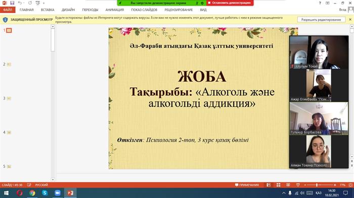 «Жалпы және қолданбалы психология» кафедрасы, психология мамандығының 3-курс студенттері 18.02.2021 жылы Зум платформасының негізінде «Айналаңды нұрландыр» атты жобасына арналған «Алкоголь және алкогольді аддикция» бағдарламасын өткізді.