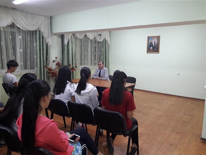 05.09.2016. Сағат 19.00 бен 22.00 аралығында 9 жатақханада кезекшілік атқардым. Кезекшілік барысында бірінші курс дінтанушылармен «Қазақстандағы қазіргі діни жағдай. Дінтанушылардың болашағы» деген тақырыпта іс-шара ұйымдастырылды.