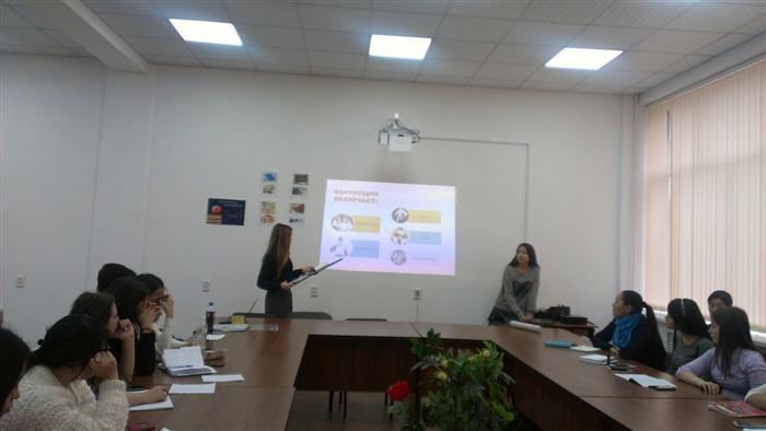 12 қараша күні философия және саясаттану факультетінде "Педагогика және психология" мамандығы 2 курс магистранттарымен жемқорлыққа қарсы бағытталған шара өтті. Бұл шара жемқорлық туралы ақпараттық бөлімнен және жаттығулардан тұрды, жемқорлық жайлы студенттердің ой өрісін кеңейтуге, жемқорлыққа қарсы ой қабілетің дамытуға, шын әлемді дұрыс бағалауға бағыттылған.