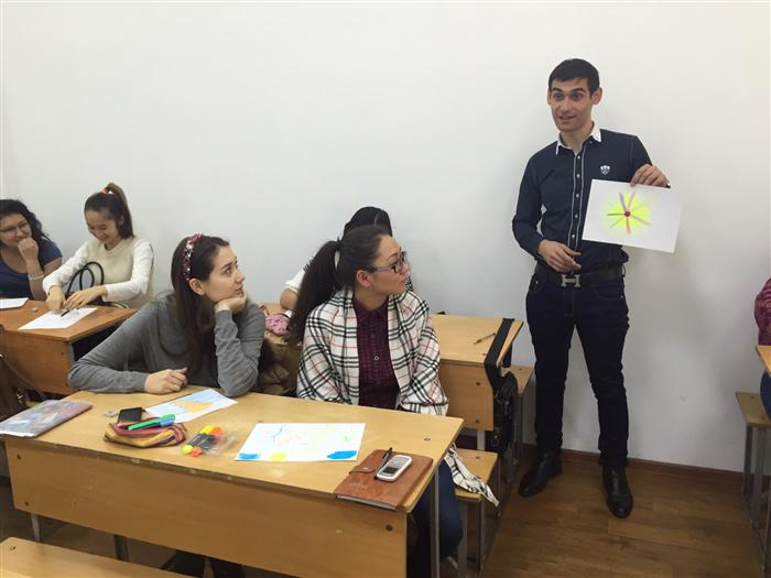 2015 жылдың 3 желтоқсанында, 124 аудиторияда сағат 13-00 де "Педагогика және психология" мамандығы 4 курс студенттерінің куратор-эдвайзері Мұқашева А.Б. "Айналаңды нұрландыр!" жобасы шеңберінде "Түстер құпиясы" тақырыбында ашық кураторлық сағат өткізді.