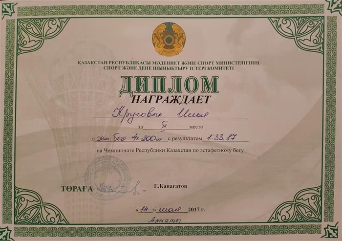 2017 жыл Қазақстан Республикасының жеңіл атлетикадан өткен чемпионатында эстафеталық жүгіруден “Педагогика және білім беру менеджменті ”кафедрасының студенті Круговых Илья III- ші орын алды.