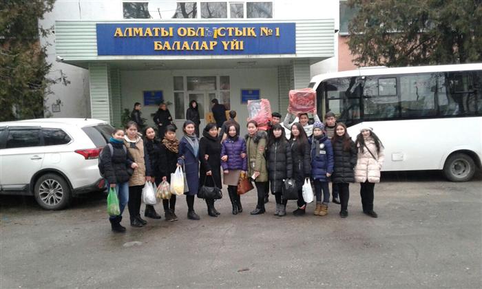 09.12.2016 ж. сағат 16.00-де «Айналаңды нұрландыр!» жобасы аясында №1 балалар үйінде жоғарғы оқу орнына дейінгі білім беру факультеті ЖОО-ға дейінгі дайындық кафедрасының ұйымдастыруымен «Жетім көрсең, жебей жүр!» атты қайырымдылық шарасын өткізді. Балалармен кездескен тыңдаушылар оларға арнап алған сыйлықтарын тапсырды.
