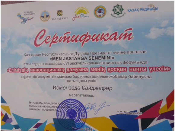 Бұл дәстүрге айналған форум жылдан жылға қанатын жайып келеді. Осы форумға біздің ЖОО-ға дейінгі білім беру факультетіде қатысты 9 топ тыңдаушымыз өз үлесін қосты. 9топ тыңдаушысы Исморзода Сайджафар студенттік инновациялық әлеуметтік маңызы бар жобалар «Менің елімнің дамуына қосқан инновациялық нақты үлесім» байқауы бойынша «DURING ALUMINIUM SMELTING PROCESS» атты жобасын ағылшын тілінде қорғап, өз үлесін қосқаны үшін сертификатпен марапатталды.