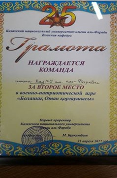 21 сәуір күні ҚазҰУ әскери кафедрасында Қарулы Күштердің 25 жылдығына және Ұлы Жеңіс Күніне орай Алматы қаласының мектептері арасында ҚазҰУ ректорының Кубогына «Болашақ Отан қорғаушысы» атты патриоттық ойын өтті. Бұл жарыста Алматы қаласының әр ауданынан келген ең мықты 8 мектептері бақ сынасты. Жарыс оқушылардың әскери дайындықтарымен қатар шығармашылық қабілеттері мен білім деңгейлерін айқын көрсетті. Патриоттық ойын әртүрлі қиын да қызық сайыстардан тұрды. Осы сайыстарда көштің басын ұстап, «Бөбек» мектебі алтын медаль иегері болды.Ал «Бөбек» мектебін қостаған ҚазҰУ бейіндік мектебі күміс медаль алды. Көшті аяқтап, № 179 мектебі қоржындарын қола медальмен толықтырды. Бейіндік мектептің мұғалімдері мен оқушылары «Болашақ Отан қорғаушысы» патриоттық ойынның жүлдегерлерін шын жүректен құттықтайды.