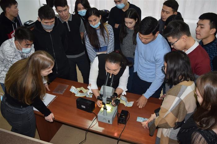 Криминалистика бөлімінің қызметкері М.Б. Бадырова Департаменттің криминалистика бөлімінің жұмысы туралы айтып, арнайы құралдарды қолдана отырып, жалған купюралар мен есепке алу-бақылау маркаларын зерттеу тәсілдерін көрсетті.