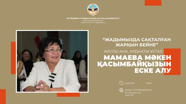 02.03.2021 ж. Филология және әлем тілдері факультеті қазақ тіл білімі кафедрасының ұйымдастыруымен «Жадымызда сақталған жарқын бейне» атты аяулы ана, ардақты ұстаз Мамаева Макен Қасымбайқызын еске алу өтті.