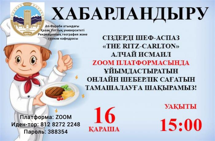 2020 жылдың 16 қарашасында сағат 15.00 " The Ritz-Carlton "шеф-аспазы Алтай Исмаилдың мастер-классты өткізді. Алчай Исмаил тағам дайындау құпиясымен бөлісті. Шеберлік сабағына 30 адам қатысты.