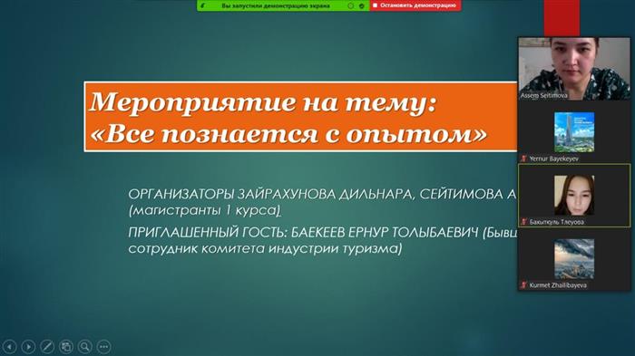 23 ақпан күні сағат 14.00-де 1 курс магистранттары Зайрахунова Дильнара мен Сейтимова Асем "барлығы тәжірибемен таныс"тақырыбында іс-шара өткізді. Іс-шарада спикерлер танымал адамдардың тәжірибесі, көтерілістер мен қателіктер туралы айтты. Қонақтар Туризм индустриясы комитетінің бұрынғы қызметкері Баекеев Ернұр Толыбайұлынан өздерін қызықтырған сұрақтарын қою мүмкіндігіне ие болды. Ол өзінің баға жетпес тәжірибесімен бөлісті, сонымен қатар сұхбат барысында қандай қателіктер жіберудің қажеті жоқ екенін айтты.
