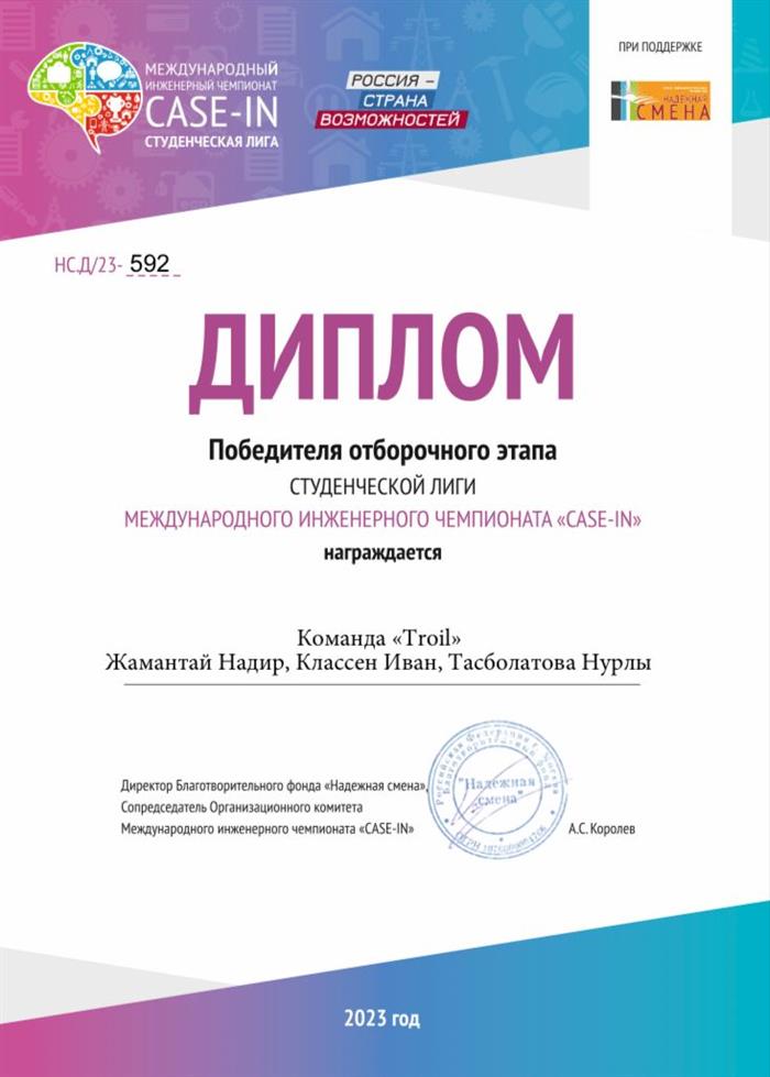 Қазақ ұлттық университеті химия жәгне химиялық технология факультеті «Troil» командасы (Команда жетекшісі – PhD, физикалық химия, катализ және мұнайхимия кафедрасы доценті Тоштай Қайнаубек) жеңімпаз атанды. Команда Университетті Мәскеу қаласында 30 мамыр – 1 маусым аралығында өтетін финалда көрсету мүмкіндігіне ие болды.