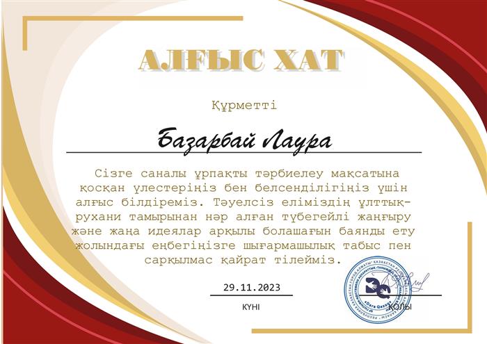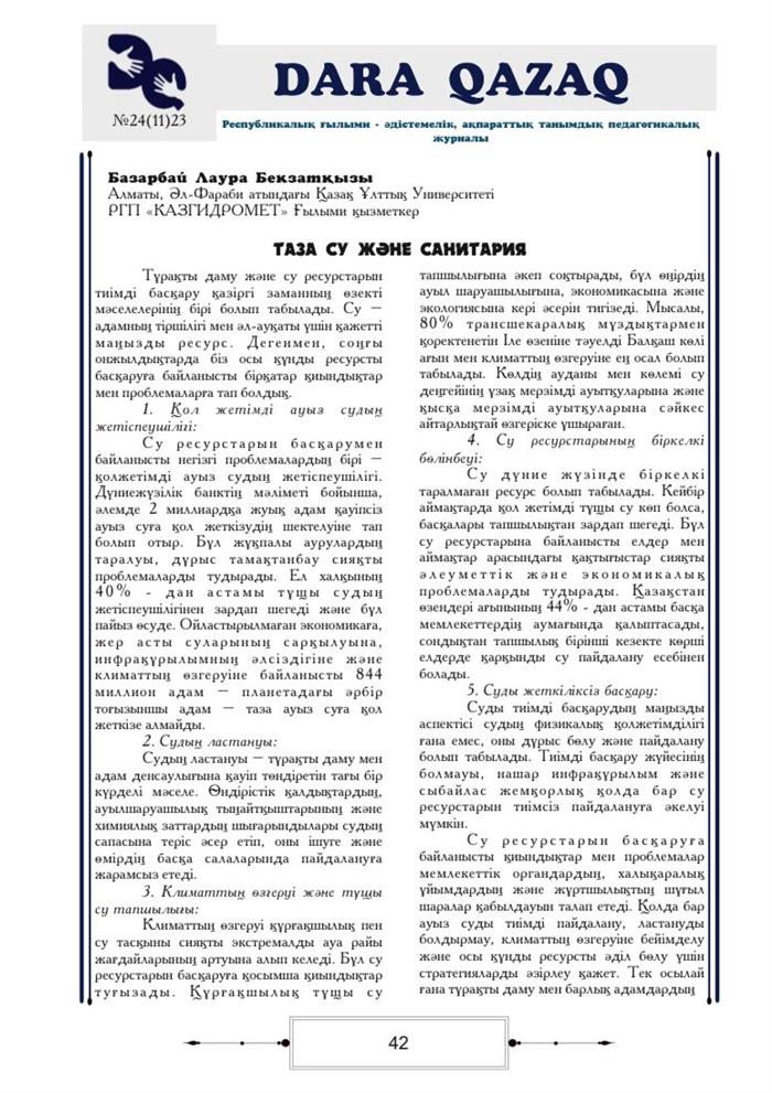 Метеорология және гидрология кафедрасының «Метеорология» мамандығының 2-курс магистратура студенті Базарбай Лаура мен кафедра оқытушысы Мунайтпасова Аида Нургалиевнаның жетекшілігімен Тұрақты даму мақсаты «Таза су және санитария» бойынша «Дара Қазақ» журналына мақала жарияланды.
