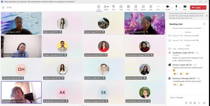 2024 жылдың 26 шілдесінде GIZ қызметкерлері үшін климаттың өзгеруінің адам денсаулығына әсері туралы семинар өтті. Іс-шараның идеясы қызметкерлерді климаттың өзгеруі және адам денсаулығымен байланысы саласындағы сараптамалық ақпаратпен таныстыру болып табылады. Кездесудің мақсаты – климаттың өзгеруінің адам денсаулығына әсері саласындағы ғылыми зерттеулерді ұсыну және талқылау. Баяндамашы Нысанбаева Айман Сағынбайқызы – география ғылымдарының кандидаты, әл-Фараби атындағы ҚазҰУ география және табиғатты пайдалану факультетінің метеорология және гидрология кафедрасының меңгерушісі. Семинарда келесі мәселелер талқыланды: