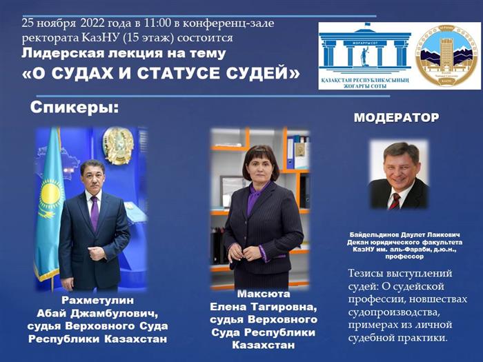2022 жылғы 25 қарашада "соттар және судьялардың мәртебесі туралы"тақырыбында көшбасшылық дәріс өтті.