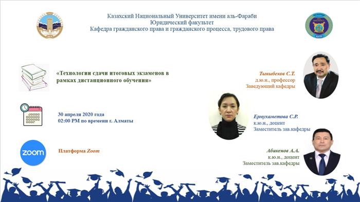 2020 жылғы 30 сәуір 14.00. ZOOM платформасында кафедра оқытушылары, докторанттары, магистранттары мен студенттері үшін "қашықтықтан оқыту шеңберінде қорытынды емтихандарды тапсыру технологиялары"тақырыбында онлайн-конференция өткізілді. Конференция ұйымдастырушылары 2019-2020 оқу жылының көктемгі семестрінің емтихан сессиясын өткізу тәртібі мен технологиясын түсіндірді. Онлайн-конференцияға кафедраның эдвайзерлік топтарының студенттері белсенді қатысты.