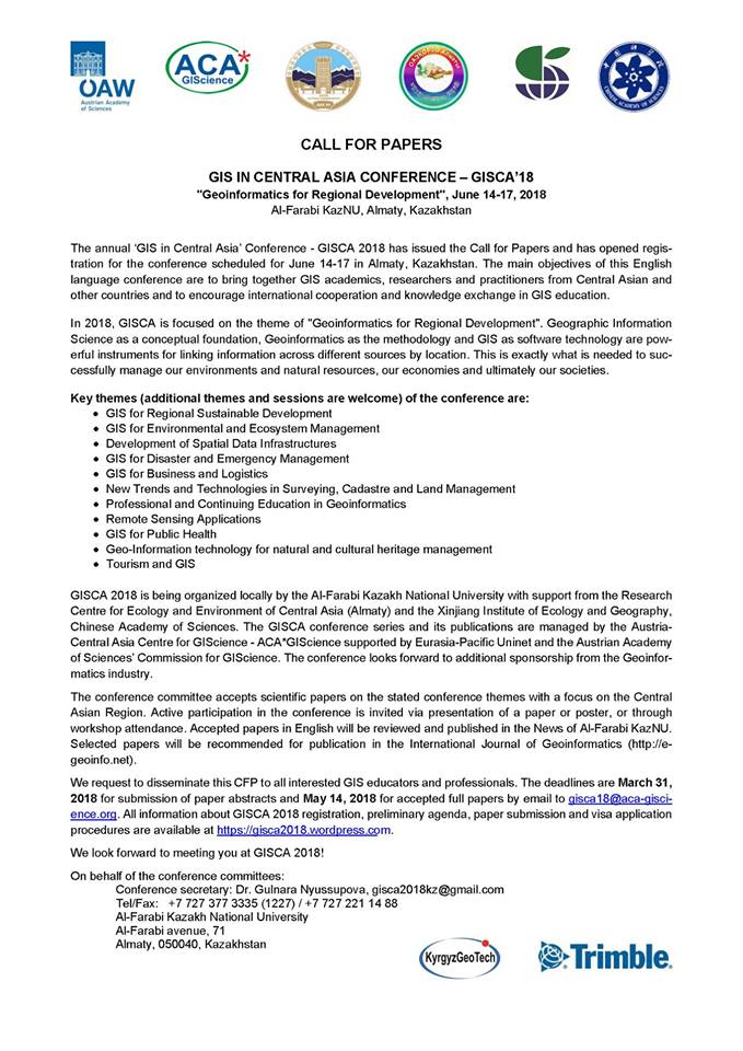 Ежегодная конференция " Гис в Центральной Азии " - gisca 2018 " Геоинформатика для регионального развития " опубликовала призыв к документам и открыла регистрацию для конференции, запланированной на июнь 14-17 года в Казахском Национальном университете имени аль-Фараби в Алматы, Казахстан. Комитет конференции принимает научные документы по следующим темам конференции с акцентом на регион Центральной Азии. Активное участие в конференции предлагается путем представления документа или плаката или путем участия в семинаре. Мы просим распространить эту cfp среди всех заинтересованных преподавателей и специалистов гис.