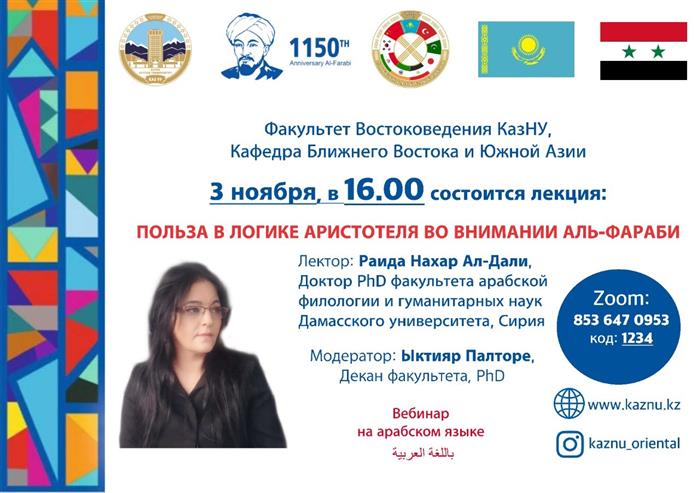 03 қазан күні онлайн форматта «әл-Фараби пайымындағы Аристотель логикасының пайдасы» тақырыбындағы онлайн вебинар өтті. Аталмыш вебинарды Сирия Араб Республикасы, Дамаск университетінің араб филологиясы мен гуманитарлық ғылымдар факультетінің ұстазы, PhD доктор Раида Нахар әл-Дали дәріс оқыды.