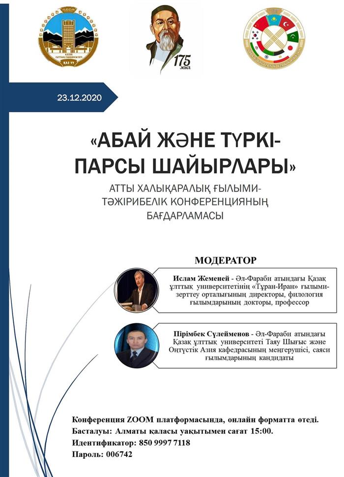2020 жылғы 23 желтоқсанда әл-Фараби атындағы Қазақ ұлттық университетінің шығыстану факультеті Таяу Шығыс және Оңтүстік Азия кафедрасы мен «Тұран-Иран» ғылыми-зерттеу орталығы бірлесе отырып ұйымдастырған ойшыл ақын Абай Құнанбайұлының 175-жылдық мерейтойына орай онлайн форматтағы «Абай және түркі-парсы шайырлары» атты халықаралық ғылыми-конференция өтті.