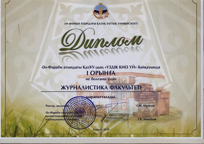 2019 жылы Журналистика факультеті Әз-Наурыз мерекесінде әл-Фараби атындағы ҚазҰУ-дың "Үздік киіз үй" байқауында І орынға ие болды. |
