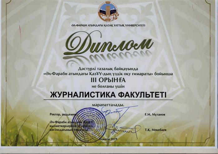 2019 жылы Журналистика факультеті дәстүрлі тазалық байқауында "Әл-Фараби атындағы ҚазҰУ-дың үздік оқу ғимараты" бойынша ІІІ орынға ие болды. |