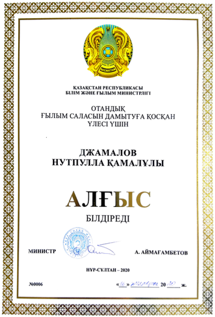 Әл-Фараби атындағы Қазақ ұлттық университеті механика – математика факультеті Механика кафедрасының доценті, техника ғылымдарының кандидаты Нутпулла Қамалұлы Джамалов Қазақстан Республикасының тәелсіздік күніне орай Отандық ғылым саласын дамытуға қосқан үлесі үшін Қазақстан Республикасы Білім және ғылым министрі А. Аймағамбетовтың Алғысына ие болды!