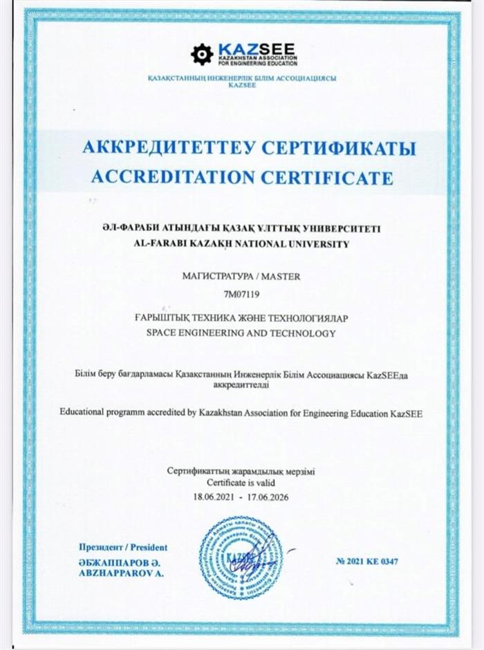 "Механика-6B05403" және магистратура "Механика-7М05404" , "Ғарыштық техника және технологиялар-6B07111" және магистратура "Ғарыштық техника және технологиялар-7М07119" білім беру бағдарламалары аккредиттелді.