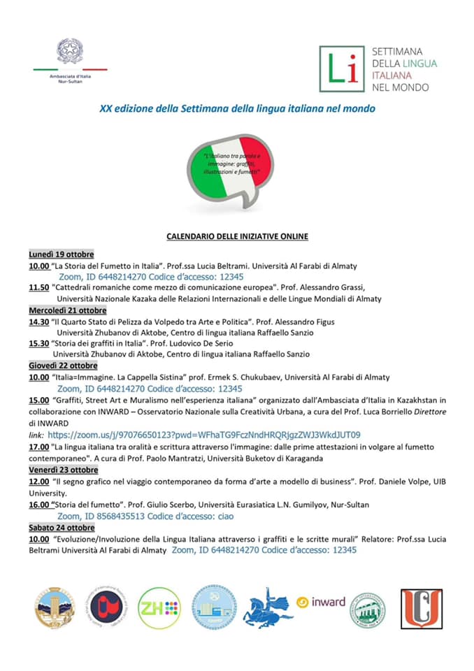 10.00 «Граффити және қабырға жазбалары арқылы итальян тілінің эволюциясы / инволюциясы» Проф. Люсия Белтрами атындағы ҚазҰУ. al-Farabi Almaty Zoom, ID 6448214270 Codice d'accesso: 12345