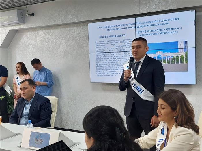 1000 түлектен тұратын шеру: Басқарма Төрағасы - әл-Фараби атындағы ҚазҰУ ректоры Ж. Қ. Түймебаев түрлі жылдардағы белгілі түлектермен (ЭжБЖМ-нен Мұқаев Дәулет Төлеутайұлы-ҚР Парламенті Мәжілісінің депутаты, ЭжБЖМ-нің түлектері қауымдастығы кеңесінің төрағасы, 2013 ж. түлегі)