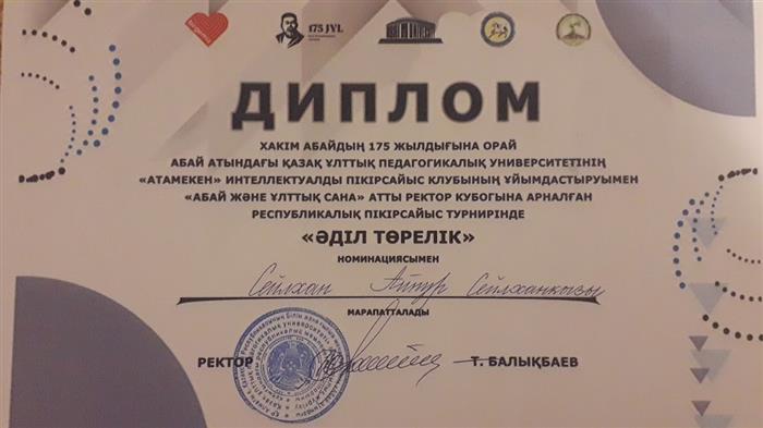 Хакім Абайдың 175 жылдығына орай Абай атындағы Қазақ ұлттық педагогикалық университетінің ұйымдастыруымен «Абай және Ұлттық сана» атты ректор кубогына арналған республикалық пікірсайыс турнирінде «Әділ Төрелік» номинациясымен әл-Фараби атындағы ҚазҰУ-нің Биоалуантүрлілік және биоресурстар кафедрасының аға оқытушысы, Phd Cейлхан Айнур Сейлханкызы марапатталды