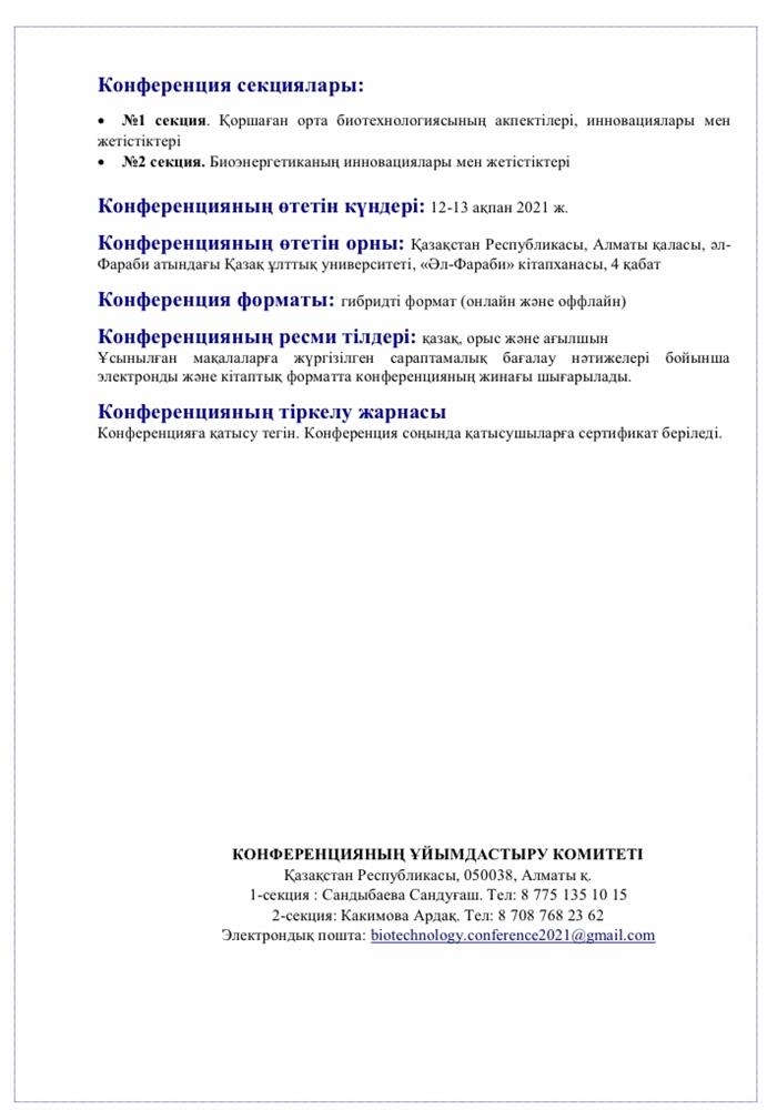 «ҚОРШАҒАН ОРТА БИОТЕХНОЛОГИЯСЫ ЖӘНЕ БИОЭНЕРГЕТИКАНЫҢ АСПЕКТІЛЕРІ МЕН ИННОВАЦИЯЛАРЫ» ХАЛЫҚАРАЛЫҚ ҒЫЛЫМИ-ПРАКТИКАЛЫҚ КОНФЕРЕНЦИЯСЫ