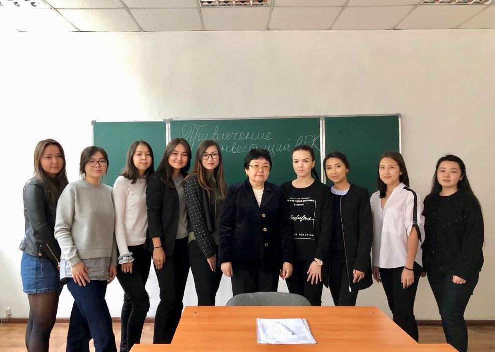 "Айналаңды нұрландыр” жобасы аясында 2018 жылдың 11 қазаңында 3-курс Халықаралық құқық мамандығының 72-Р тобы студенттерімен “Қазақстан Республикасының сыртқыэкономикалық қызметінің құқықтық реттеуіндегі инвестициялар” тақырыбында дөңгелек үстел өткізілді. Оның барысында Қазақстанға шетел инвестицияларын тартудың амалдары, сондай-ақ олардың құқықтық реттелуі талқыланды.