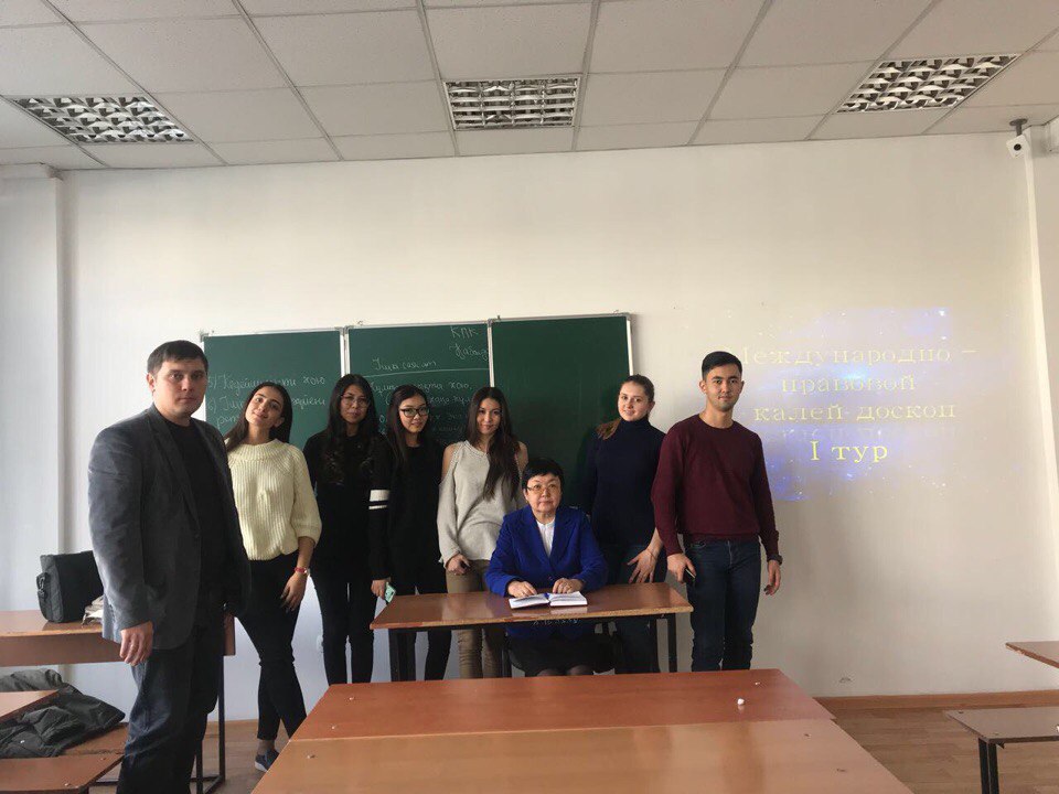 24.11.2017Айналаңды нұрландыр» жобасының аясында Халықаралық құқық мамандығының орыс бөлімінің төртінші курс студенттерінің ұйымдастыруымен және з.ғ.к., доцент Досымбекова М.С, phd докторы Баймагамбетова З.М., з.ғ.к., аға оқытушы Татаринов Д.В. қолдауымен «Халықаралық құқық туралы не билемін?» тақырыбында интеллектуалды ойын өткізді.
