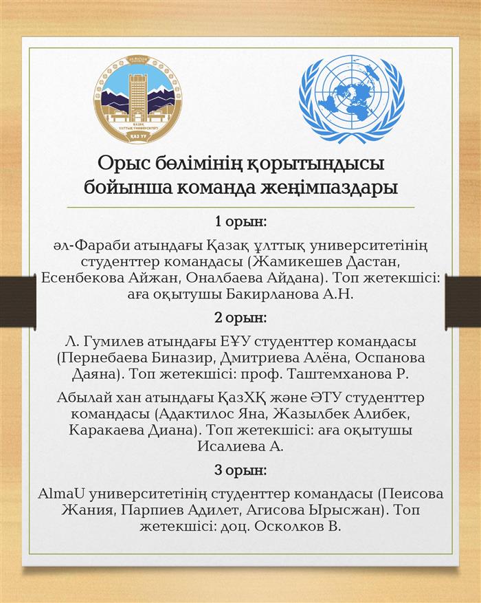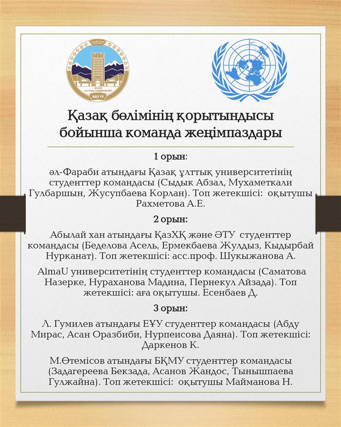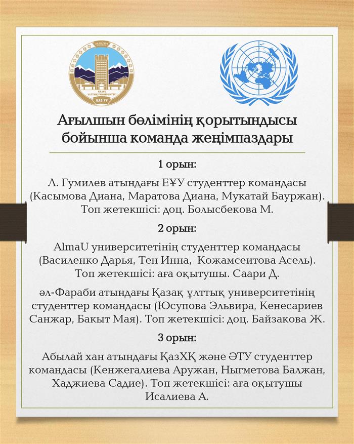 2020 жылдың 31 наурызында олимпиаданың нәтижелерін БҰҰ-ның Ғаламдық коммуникациялар бөлімінің бастығы Властимил Самек басқарған конкурстық комиссиясы қашықтықтан қорытындылды. Нәтижелері әл-Фараби атындағы ҚазҰУ-дың ресми сайтында жарияланды (сілтемесі).