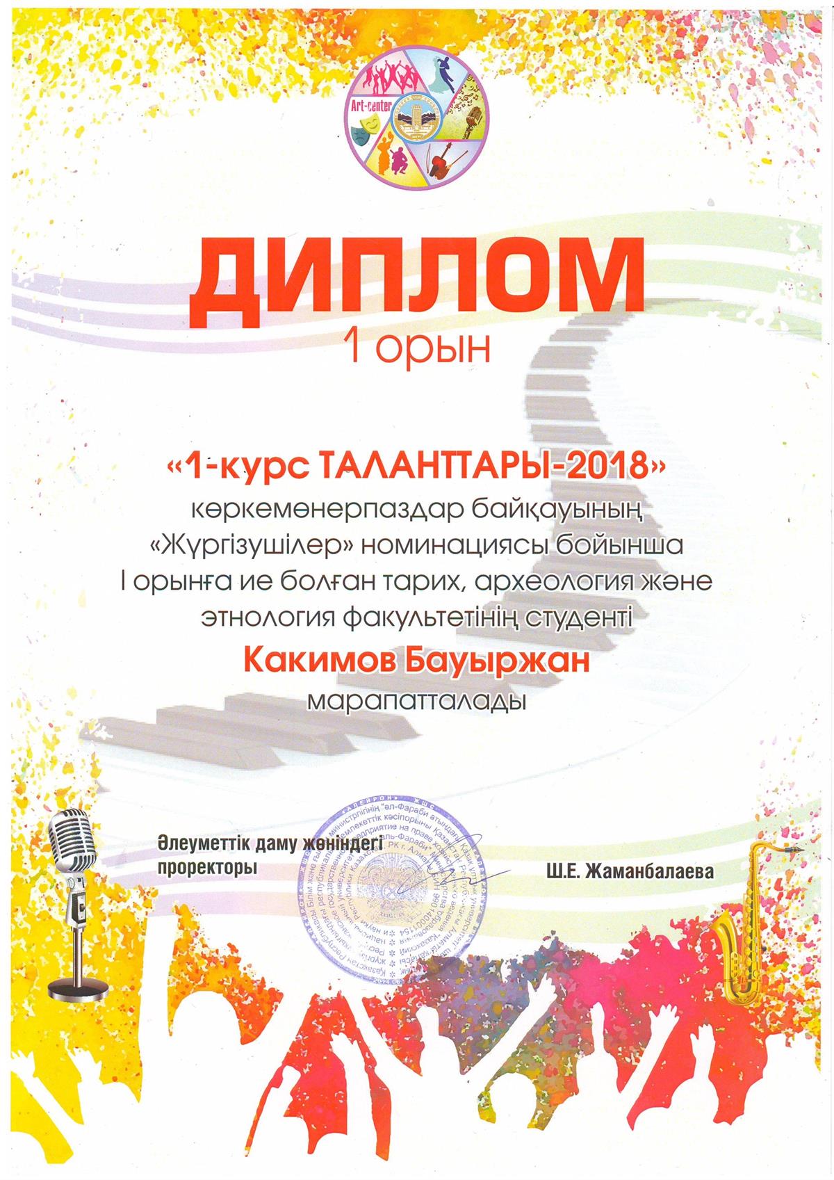 01.11.2018Әл-Фараби атындағы ҚазҰУ-да 1 курс студенттері арасында "1-курс таланттары 2018"байқауы өтті. Сайыс бірнеше номинациялар бойынша өтті, олар бойынша қатысушылар өз қабілеттері мен таланттарын көрсетті. "Мұрағаттану және құжаттану" мамандығының бірінші курс студенті Какимов Бауыржан "жүргізушілер"номинациясы бойынша 1-ші орынға ие болды.