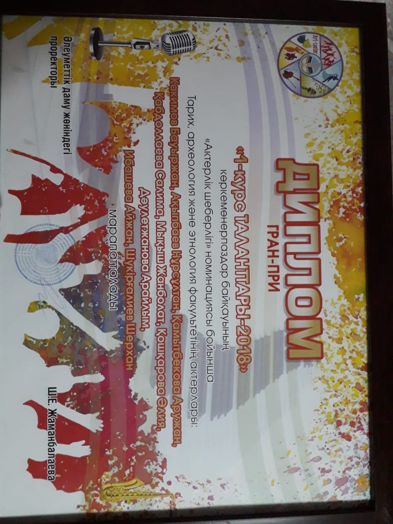 Әл-Фараби атындағы ҚазҰУ-да 1 курс студенттері арасында "1 курс таланттары 2018" сайысы өтті. Сайыс бірнеше номинациялар бойынша өтті, олар бойынша қатысушылар өз қабілеттері мен таланттарын көрсетті. "Мұрағаттану және құжаттану" мамандығының бірінші курс студенттері "актерлік шеберлік" номинациясы бойынша Какимов Бауыржан және Ибашева Айжан Гран-при дипломымен марапатталды.