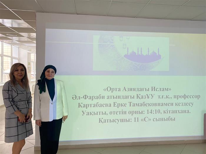 Дүние жүзі тарихы, тарихнама және деректану кафедрасының доценті, т.ғ.к. Қартабаева Е.Т. Алматы қаласындағы Назарбаев зияткерлік мектебі (физика-математика бағыты) оқушыларына «Орталық Азиядағы ислам» тақырыбында дәріс оқыды. Дәріс барысында оқушылармен тығыз байланыс орнатылды, оқушылар дәріске ерекше қызығушылық танытты, өздерін толғандырып жүрген сұрақтарына жауап алды.