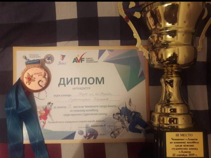 2019 жылы 22 қыркүйекте Алматы қаласында Қазақстан Республикасы жоғары оқу орындарының ерлер командалары арасында жағажай волейболынан Алматы қаласының Чемпионаты аяқталды. Осы жарыстарда дене шынықтыру және спорт кафедрасының 3 курс студенті Сайдазимов Мухаммадали командалық есепте 3 орын алды.