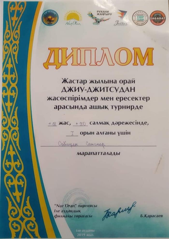 2019 жылдың шілде айында Алматы облысында «Nur Otan» партиясының қолдауымен өткен Жастар жылына орай Джиу-Джитсудан жасөспірімдер мен ересектер арасында ашық турнирінде, дене шынықтыру және спорт кафедрасының 4 курс студенті Сәбиұлы Санжар +90 кг салмақ дәрежесінде 1 орынға ие болды.