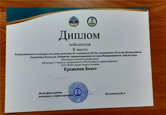 Қазақстан Республикасы Тәуелсіздігінің 30 жылдығына арналған медициналық ЖОО магистранттары арасында "Тәуелсіздік жылдарындағы денсаулық сақтаудың дамуы: менің көзқарасым"атты республикалық эссе байқауымызда 1 орынды "Қоғамдық денсаулық сақтау"мамандығы бойынша “Семей медицина университеті” КеАҚ магистранты – Брик Лаула Маратовна алды. 2 орынға "Қоғамдық денсаулық сақтау" мамандығы бойынша "Марат Оспанов атындағы Батыс Қазақстан медицина университетінің 2 курс студенті Ережепов Бекет ие болды. 3 орынды университетіміздің "Дәрігер-зерттеуші" мамандығы бойынша 1 курс магистранты – Омарова Индира еншіледі. Магистранттарымызға дипломдары және естелік сыйлыққатры салтанатты түрде табысталды. 1 орынға Ремарк Э. М екі кітабы, 2 орынға – Донна Тартт “Щегол” романы, 3 орынға И.Есенберлиннің “Көшпенділер” кітапбы сыйға берілді. Жүлделі орынға ие болған магистранттар ризашылықтарын білдіріп, ұйымдастырушыларға рақметін айтты!