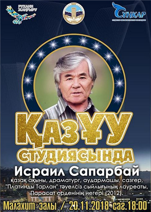 | Встреча с поэтом Иcраил Сапарбаем | 20.11.2018 | На факультетском собрании состоялась встреча с Иcраил Сапарбаем, организованная кафедрой информационных систем и профсоюзом студентов и магистрантов «Сункар». | ![]() |