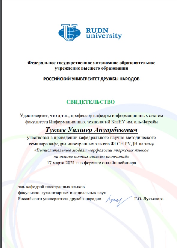 "Вычислительные модели морфологии тюркских языков на основе полных систем окончаний" тақырыбына РУДН ФГСН шет тілдер кафедрасының кафедралық ғылыми-әдістемелік семинарын өткізуге қатысқаны туралы куәлік