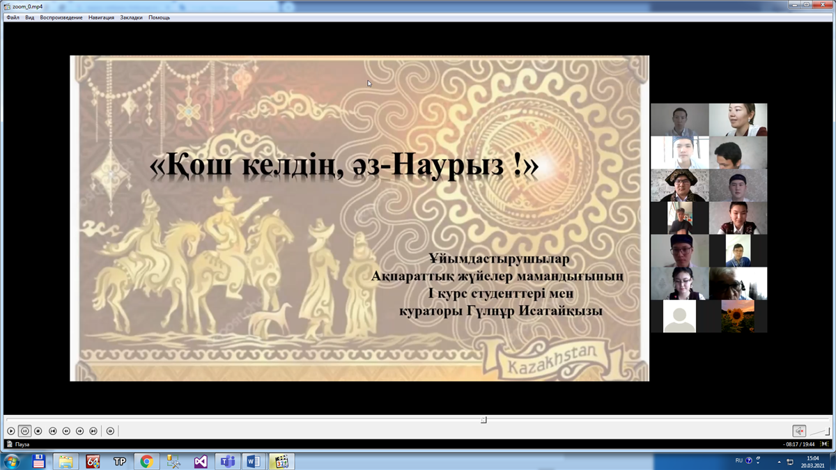 20.03.202120.03.2020 ж. «Ақпараттық жүйелер» мамандығының АЖ-20-1 тобының және куратор-эдвайзер Г.И. Ақшолақтың ұйымдастырумен Ұлыстың ұлы күні Наурыз мейрамына арналған «Қош келдің, әз-Наурыз» атты рухани құндылықтарымызды, салт-дәстүрімізді, әдет-ғұрыпымызды дәріптеуге арналған танымдық-тәрбиелік іс-шара өткізілді. Бұл іс-шара барысында Дәлеткерейдің «Көреғұлы», Н. Тілендиевтің «Аққу» күйлері орындалды. Студенттер Қыдыр ата, Алдар көсе және Тазша бала образдарын сомдап шағын көрініс ұйымдастырды. Студенттер мен іс-шараға қатысқан қонақтар арасында қазақ халқының салт-дәстүріне, ұлттық ойындар мен киімдеріне қатысты ойындар ойнатылды. Ұлттық тағам түрлері және олардың жасалу жолдары көрсетілді. Іс-шара соңында кеш қонағы Ақпараттық жүйелер кафедрасының аға оқытушысы Болат Кусаинович сөз сөйлеп, бата берді.