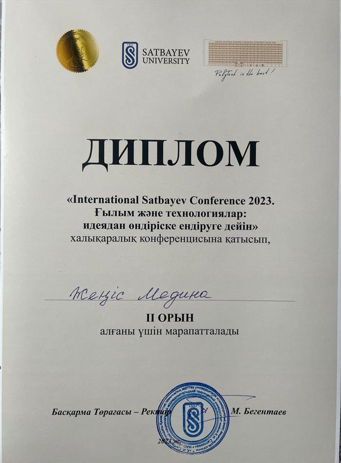 "Сатпаев оқулары-2023" конференциясында біздің студент 2 орын алды!/Жасанды интеллект және Big Data кафедрасы