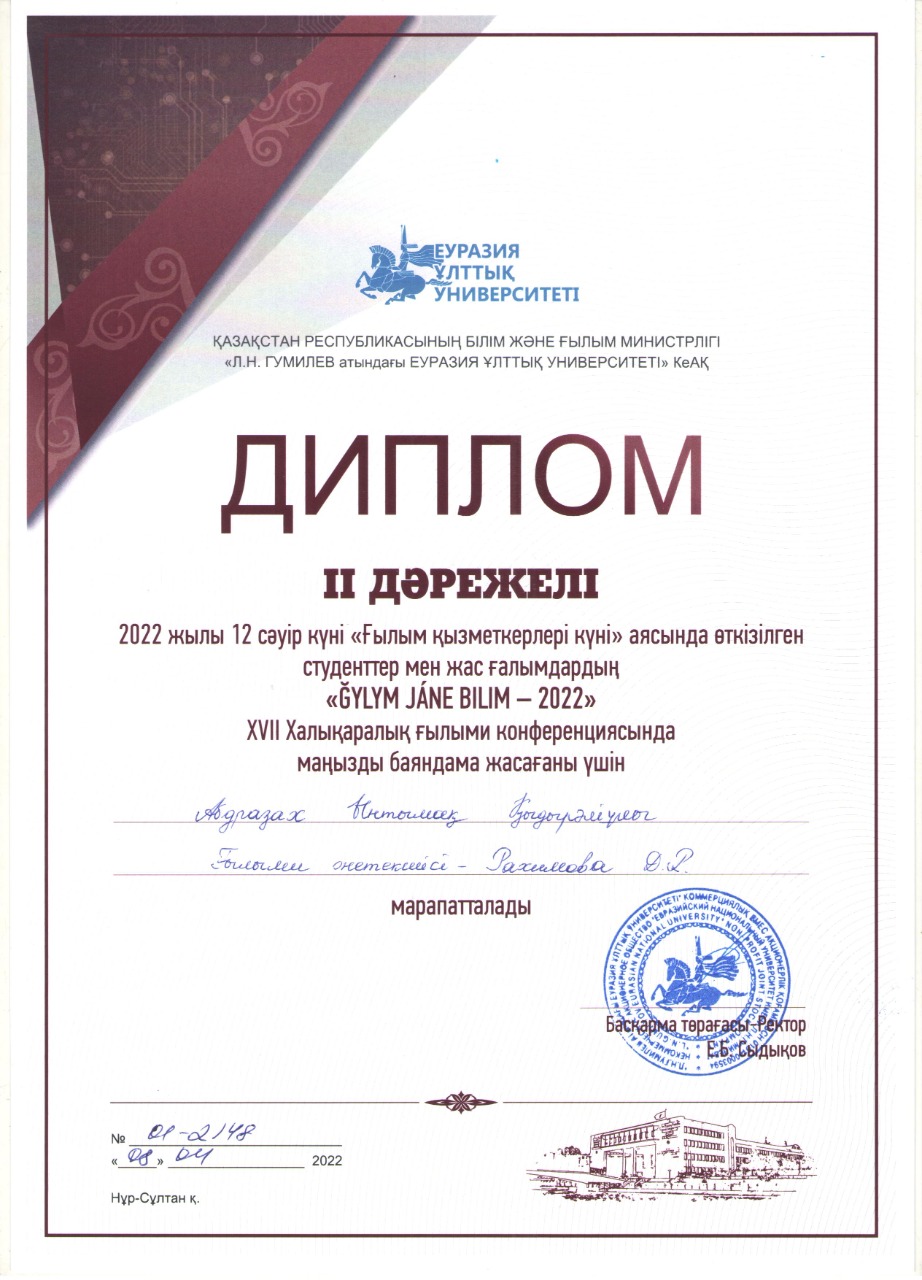 2022 жылы 12 сәуір күні "Ғылым қызметкерлері күні" аясында өткізілген студенттер мен жас ғалымдардың "Ғылым және білім - 2022" XVII Халықаралық ғылыми конференциясында маңыздыь баяндама жасағаны үшін 2 курс магистрант Әбдіразақ Ынтымақ екінші дәрежелі дипломмен марапатталды.