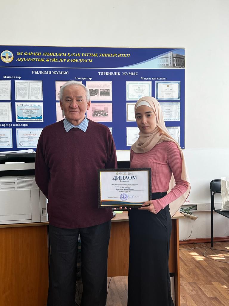 Халықаралық Фараби форумынан 1-дәрежелі диплом иегері Кундил Алия Недаль, 2-курс магистратура, Ақпараттық жүйелер мамандығы. Ғылыми жетекшісі: ф-м.ғ.к., Беделбаев А.А.