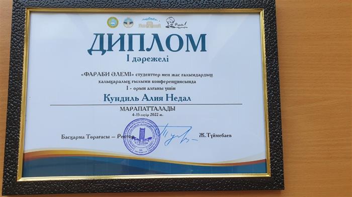 Халықаралық Фараби форумынан 1-дәрежелі диплом иегері Кундил Алия Недаль, 2-курс магистратура, Ақпараттық жүйелер мамандығы. Ғылыми жетекшісі: ф-м.ғ.к., Беделбаев А.А. Тақырыбы: Нейрондық желі арқылы көркем шығарманың эмоционалдық бояуының қалыптасу механизмін қырғыз жазушылары мысалында зерттеу.