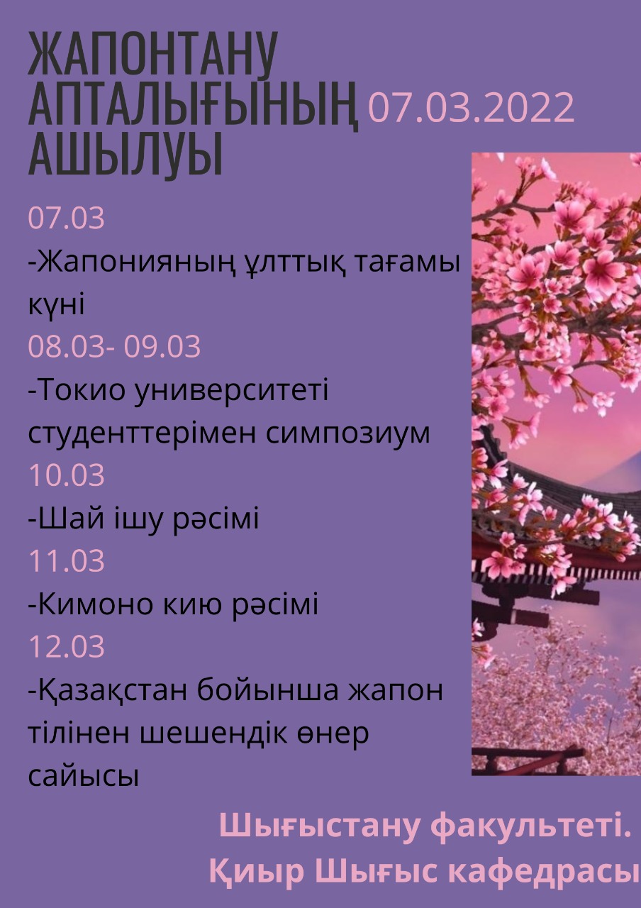 Наурыздың 14-18 аралығында, әл-Фараби атындағы ҚазҰУ, Шығыстану факультеті, Қиыр Шығыс кафедрасында “Корейтану апталығы” өтеді.